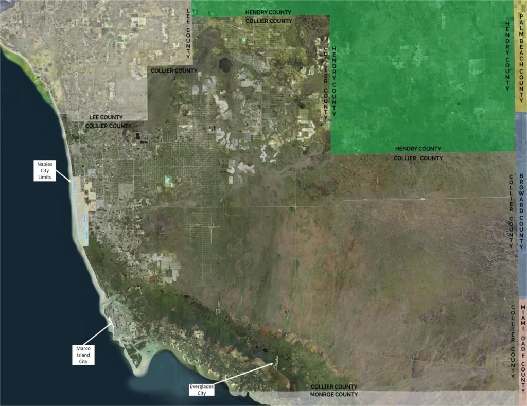 Naples is one of three cities located in Collier County, Florida, which is the largest county in Florida by land area. Collier County spans approximately 2,305 square miles (5,970 square kilometers), including about 1,998 square miles of land and 307 square miles of water. The county boasts a diverse range of landscapes, from urban areas such as Naples and Marco Island to vast natural preserves, including the Everglades and Big Cypress National Preserves.