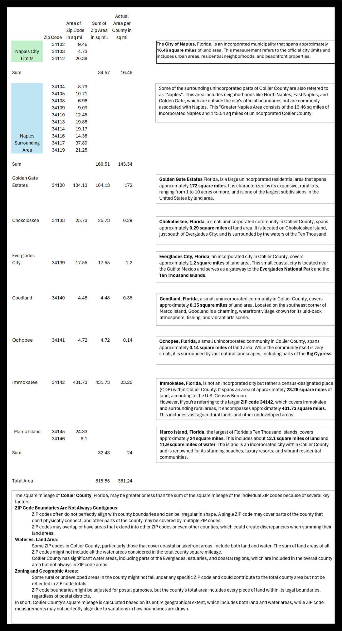 Collier County contains 21 deliverable postal ZIP codes, covering roughly 815 square miles, or about one-third of the total county area. The remaining area consists of water bodies and undeveloped land, which the U.S. Postal Service classifies as undeliverable.